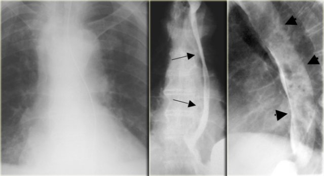 Esophagram shows widened stripe (arrows) and irregular margins of midesophageal carcinoma.
