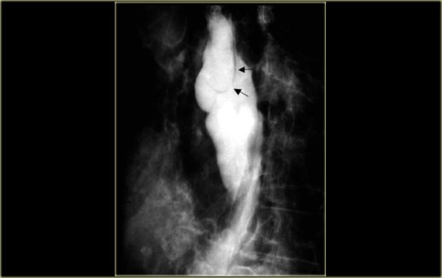 On the barium study inconstant filling defects (arrows) represent downhill varices in upper esophagus.