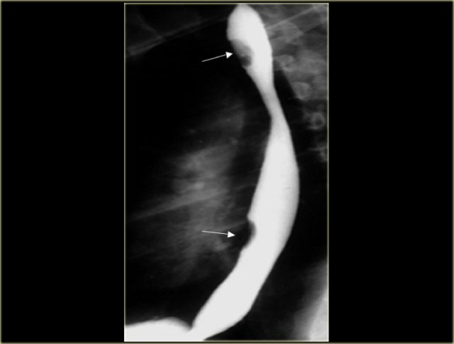 Lateral view of esophagram shows marked irregularity and esophageal narrowing (arrows).