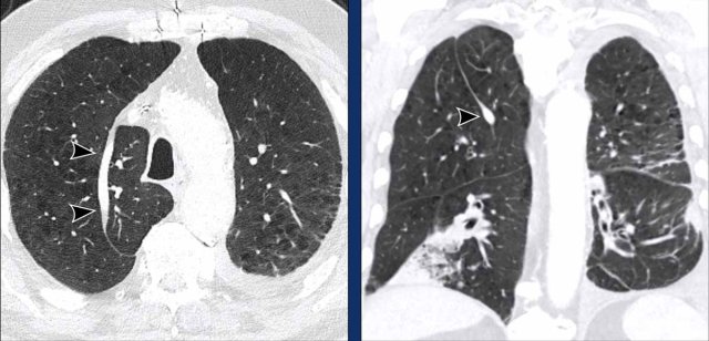Here another case, where the azygos vein courses through the azygos fissure (arrowheads).
