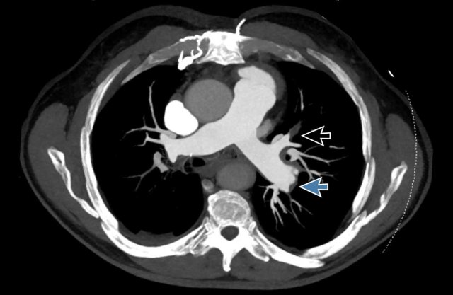 - Thrombus at the segmental bifurcation of the left upper lobe.