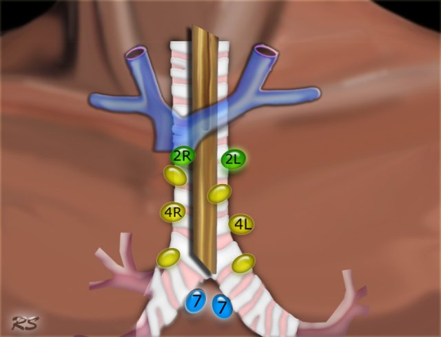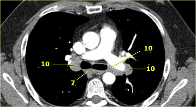 Notice also lower paratracheal nodes on the right, i.e. 4R nodes.