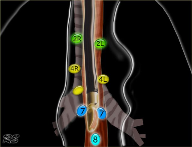 On the left a station 2 node in front of the trachea, i.e. a 2R-node.