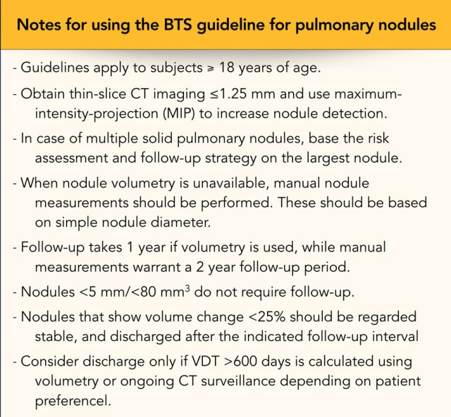 The BTS guidelines allow both measurements obtained using a 2D caliper technique and 3D nodule volumetry.