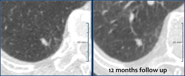 A solitary non-spiculated solid nodule of 9 mm (362 mm3) is shown in the LLL of a 75 year old female without a positive family history or emphysema.