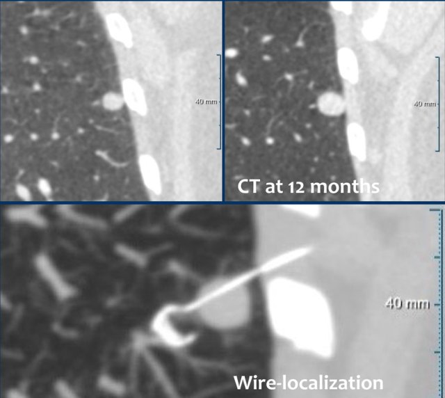 Wedge resection after wire-localization was performed, diagnosing a pulmonary carcinoid.