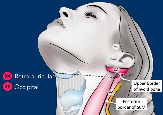 Level Xa contains the retroauricular (also called mastoid) and subauricular nodes, which includes superficial nodes lying on the mastoid process from the cranial edge of the external auditory canal cranially to the tip of the mastoid caudally.