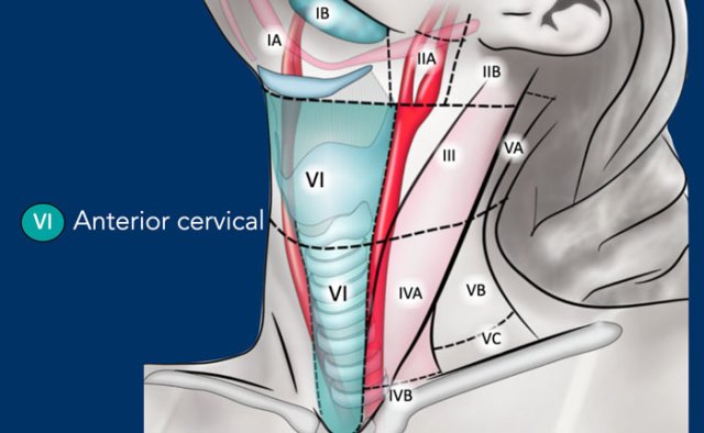 This level contains the superficial anterior jugular nodes (level VIa) and the deeper prelaryngeal, pretracheal, paratracheal and recurrent laryngeal nerve nodes (level VIb).