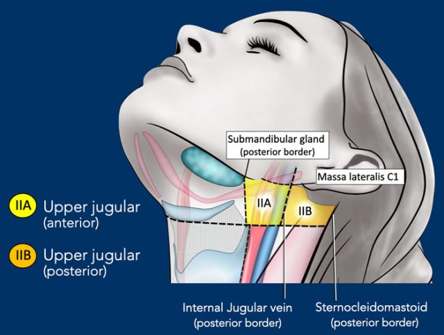 Level II can be divided into level IIa and level IIb by drawing a line at the posterior edge of the internal jugular vein.