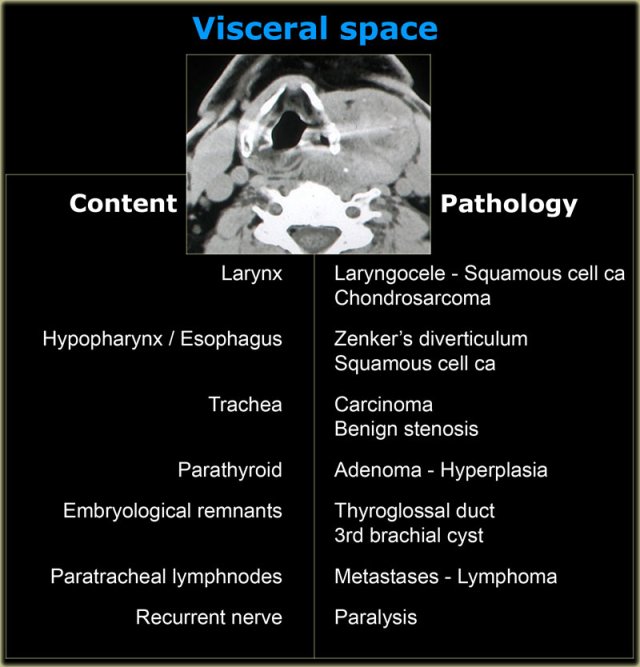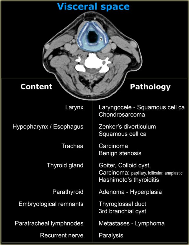 Central compartment containing several viscera like the larynx, thyroid, hypopharynx and cervical esophagus. - Carotid space