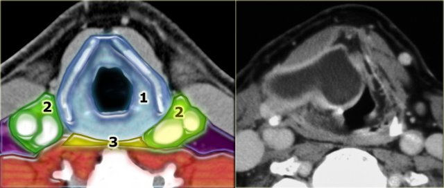 On the left two images of a patient with a piriform sinus carcinoma (shown earlier).