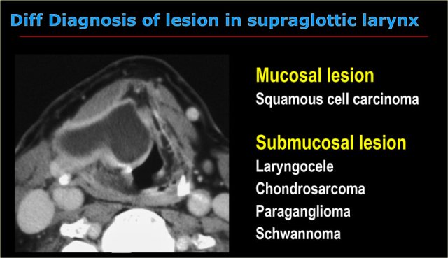 The CT section shows the lesion present at the level of the supraglottic larynx and the thyroid cartilage.