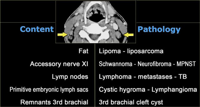 On the left a table with the normal contents of the posterior cervical space and subsequent pathology.