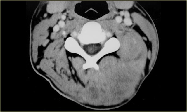 On the left a contrast enhanced CT image through the upper neck of a patient who complained of a slowly growing swelling posteriorly on the left side of the neck.