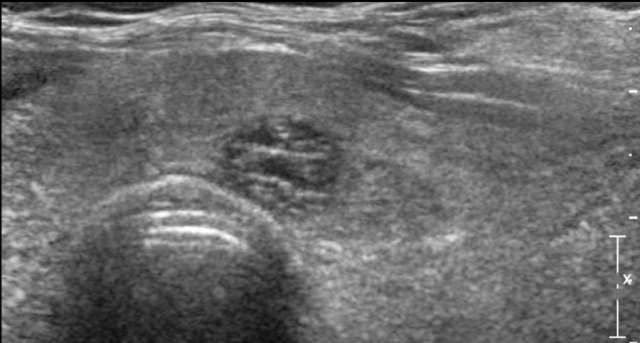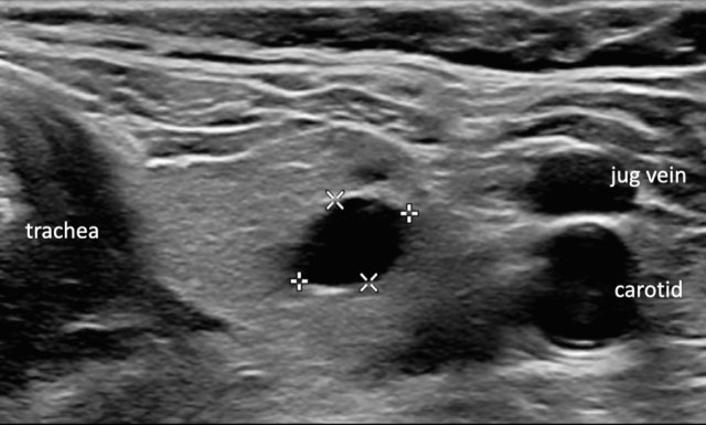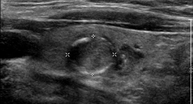 This nodule is hypoechoic compared to the normal thyroid tissue which is seen on the ventral side of the nodule.