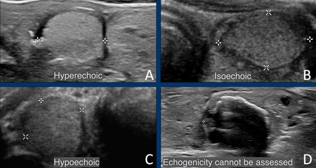 The echogenicity is compared with normal thyroid parenchyma
