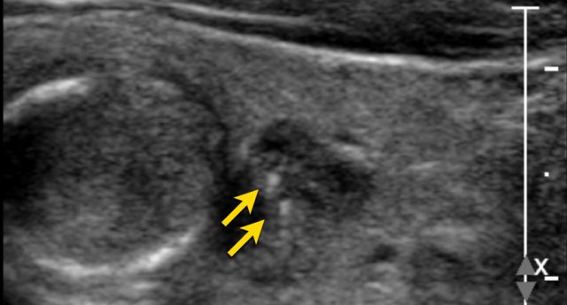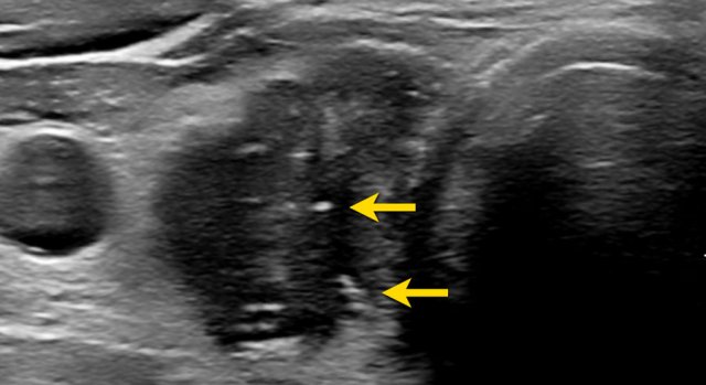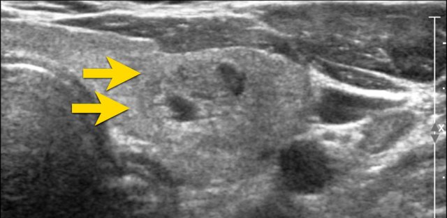 Notice that the tumor is more hypoechoic in comparison to the strap muscles (arrows).