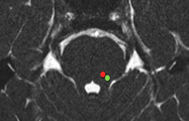 The motor nucleus is situated anteromedial to the sensory nucleus (red dot).