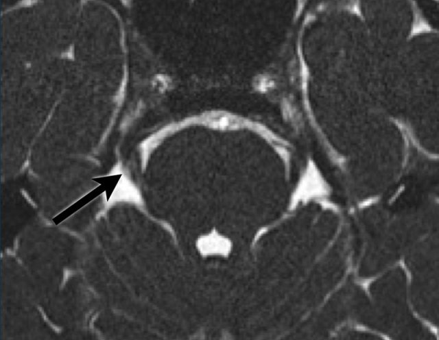 In the prepontine cistern, the sensory and motor divisions have a parallel but separate course, creating a characteristic fan-like appearance (arrow).