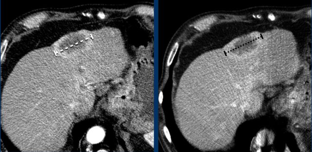 - Measurement of viable tumor on CT or MRI in the arterial phase.