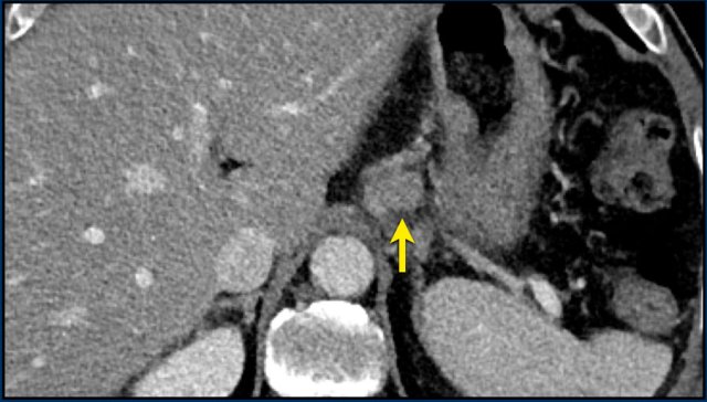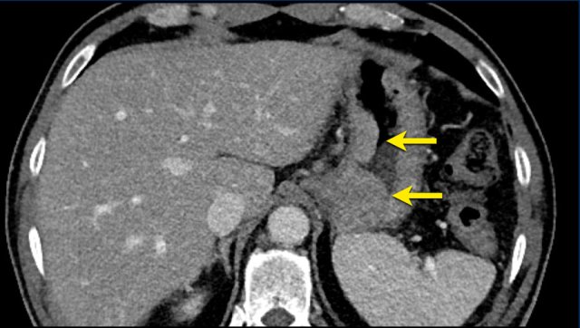 This CT image is of a 61-year-old male with gastric cancer and lymph node metastases.