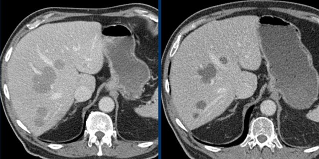 The CT images in the arterial and portovenous phase of a 71-year-old male show liver metastases of a neuro-endocrine tumour of the esophagus.