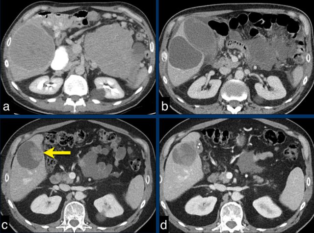 The CT images in a 66-year-old male show liver metastases of a GIST at diagnosis (a).