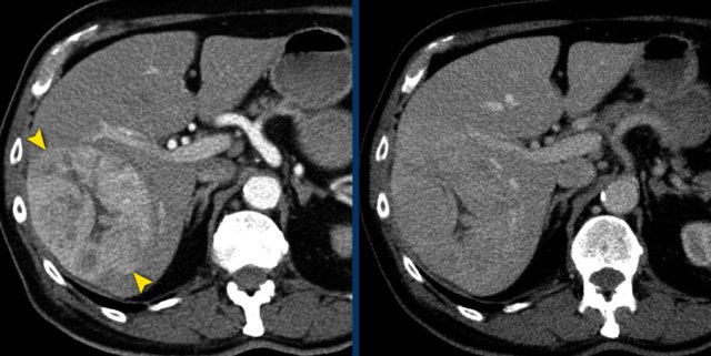 The CT image of the liver of a 96-year-old male with HCC in the late arterial phase shows a hypervascular tumour in the right liver lobe (arrowheads).