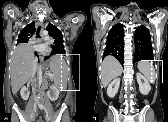 Coronal reconstructed CT images in the same patient show hepatosplenomegaly before (a) and normalization of hepatic and splenic size after (b) treatment with R-CHOP chemotherapy. Splenomegaly is defined as a vertical length >13 cm.