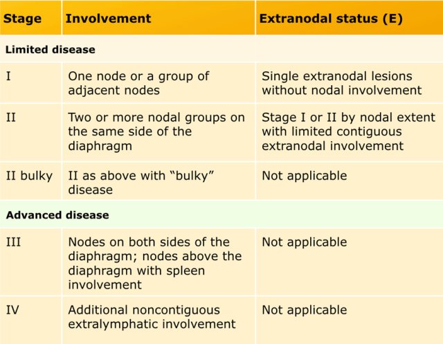 This staging system is based on the anatomical extent of disease and is divided into stages I-IV (see table).