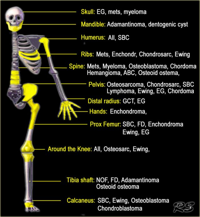 Ewing's sarcoma, SBC, ABC, Enchondroma, Fibrous dysplasia and Osteoblastoma.