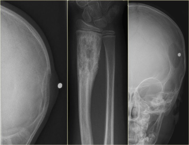 Multiple well-defined osteolytic lesions were found on a follow up CT scan.