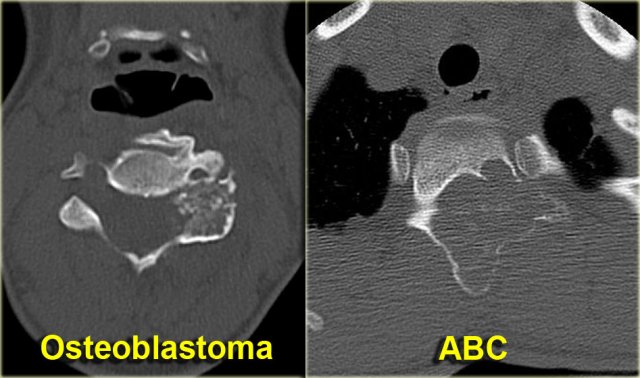 Consider osteoblastoma when ABC is in the differential diagnosis of a spine lesion (figure).