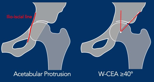 In acetabular protrusion, the acetabulum is too deep with inward displacement and global overcoverage of the femoral head. If the medial border of the femoral head extends beyond the ilio-ischial line, this is referred to as acetabular protrusion.