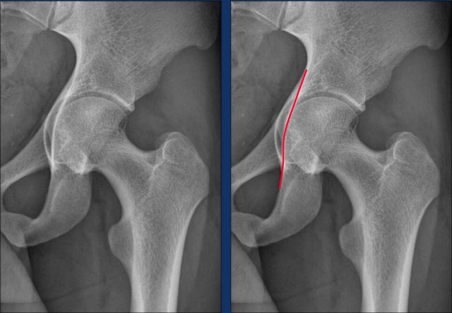 This is another example of subspine impingement in a 28-year-old amateur football player who sustained acute trauma to the right hip region eight months ago.