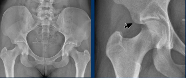 This has resulted in bony overgrowth, causing impingement. on the femoral head/neck region.