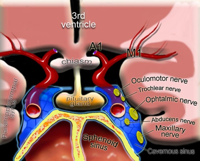 On the left a coronal illustration of the anatomy of the pituitary gland and the surrounding structures.
