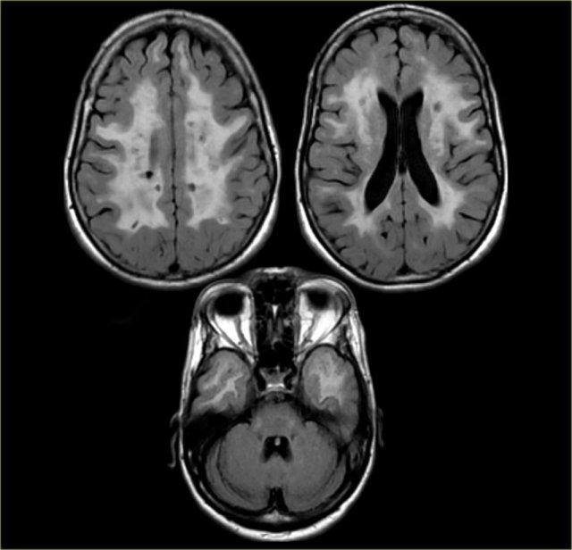 Confluent white matter hyperintesities in the frontal and especially anterior temporal lobes in combination with (lacunar) infarcts and microbleeds are seen on imaging.