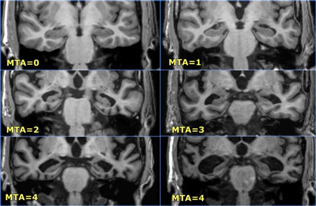 - Alzheimer's disease (AD): medial temporal lobe atrophy (MTA) and parietal atrophy.