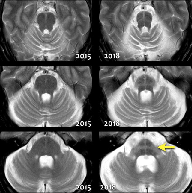 Notice the extreme atrophy of the pons and the cerebellum in this patient when we compare images of 2015 with images of 2018.