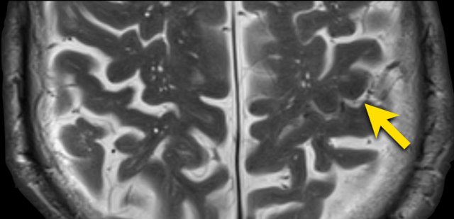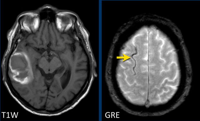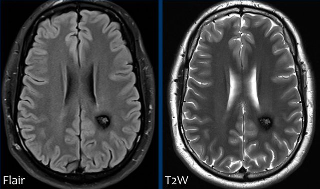 This example shows the typically appearance on MRI named “popcorn lesions”: a complete hemosiderin ring surrounding a heterogeneous lesion.
