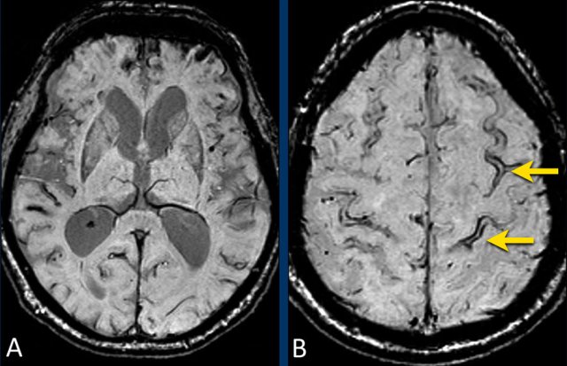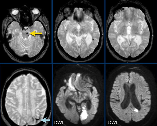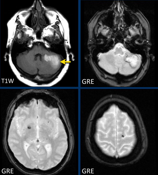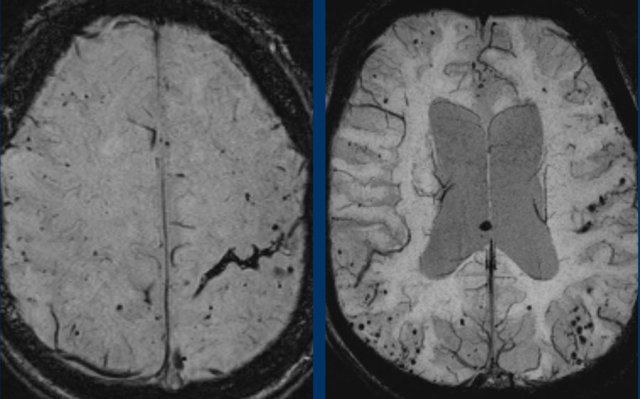 The gradient echo-images show multiple microbleeds.
