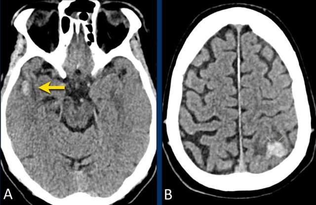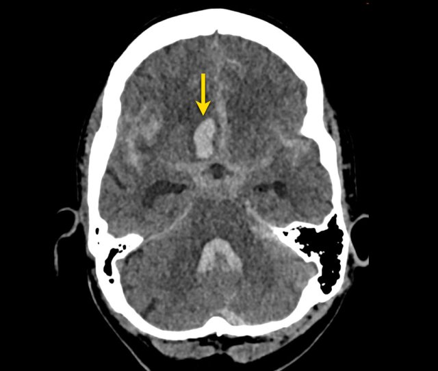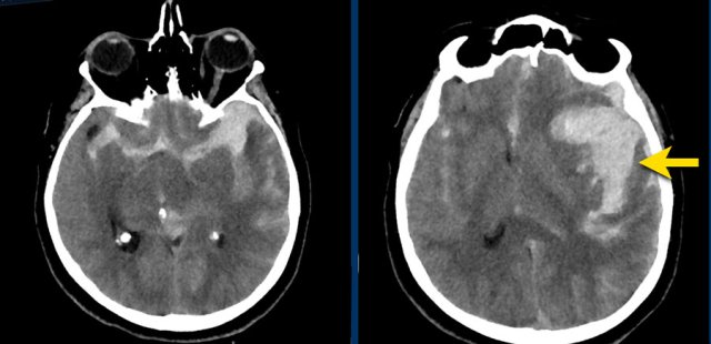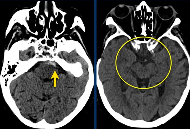 NCCT shows bilateral subarachnoid hemorrhage and a parenchymal hemorrhage (yellow arrow).