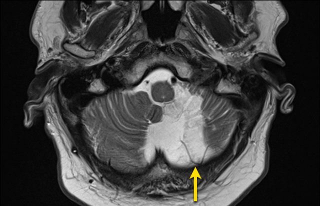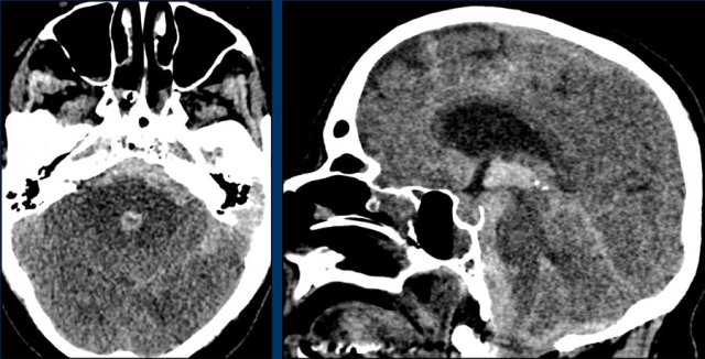 This patient presented with a cerebellar hematoma.