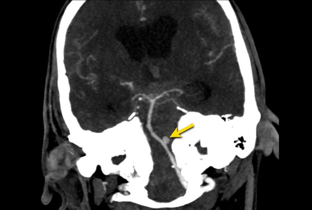 On the 3D TOFMRA there was arterialization of the vein of Labbé (arrow).