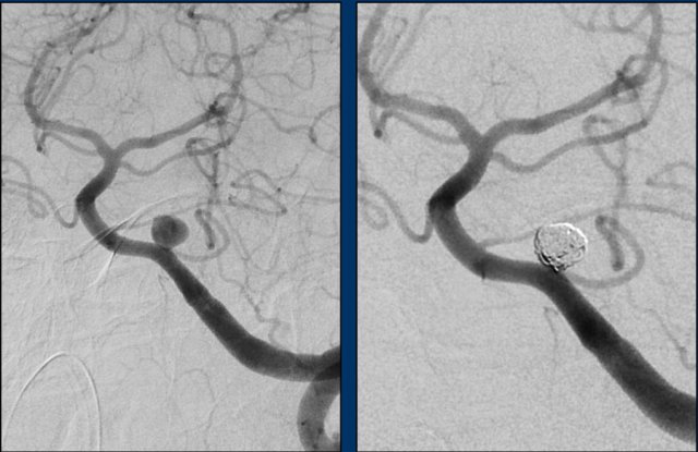 Left image: DSA of the aneurysm before treatment.