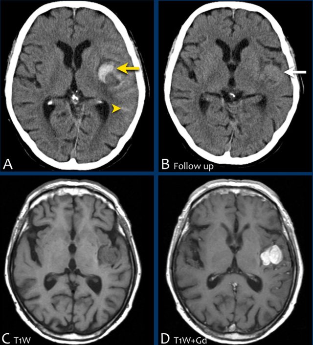 The follow up image one year later shows linear cavitation due to tissue loss (arrow) and hypodensity of the basal ganglia as a result of gliosis.