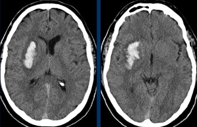 The images show a hemorrhage in the basal ganglia in a patient with longstanding hypertension.