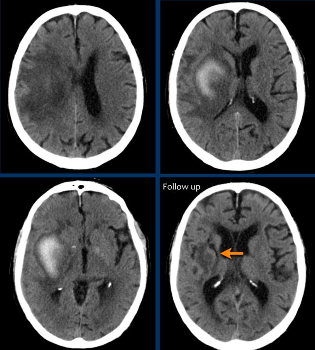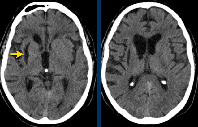 On a follow up scan only parenchymal loss is seen in the putamen where the hemorrhage was located (arrow).