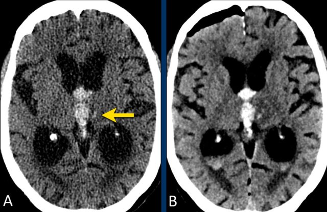 Note the very small hyperdensity in the left thalamus, which is the origin of the hemorrhage.